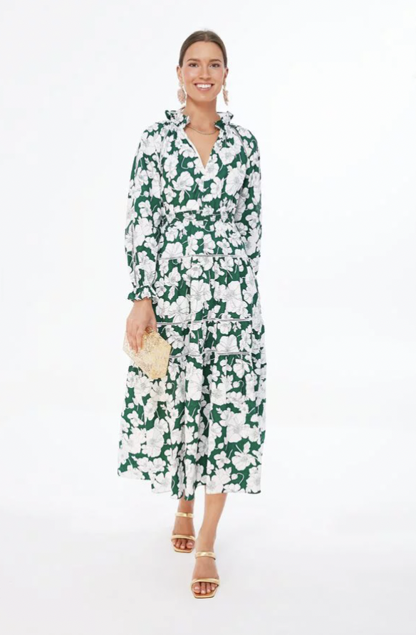 The transitional print of the Green Floral Tiered Presley Maxi Dress is as versatile as it is beautiful. Featuring ladder trim detailing, V-neck, and ruffle detail at the collar, this dress will take you from season to season effortlessly.
