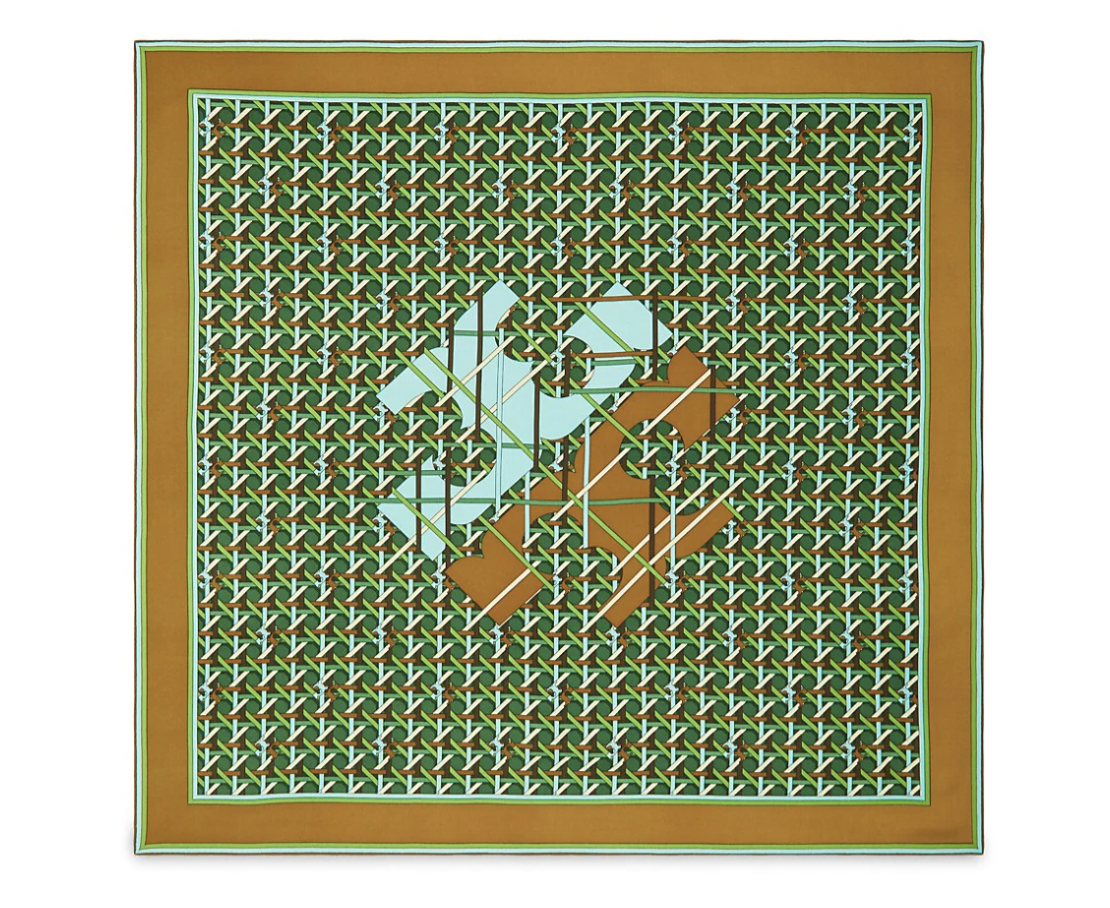 The Tory Burch “T” motif is accented by a basket weave design and bordered with a coordinating gold edge. You can purchase the Basketweave Silk Scarf Square here.