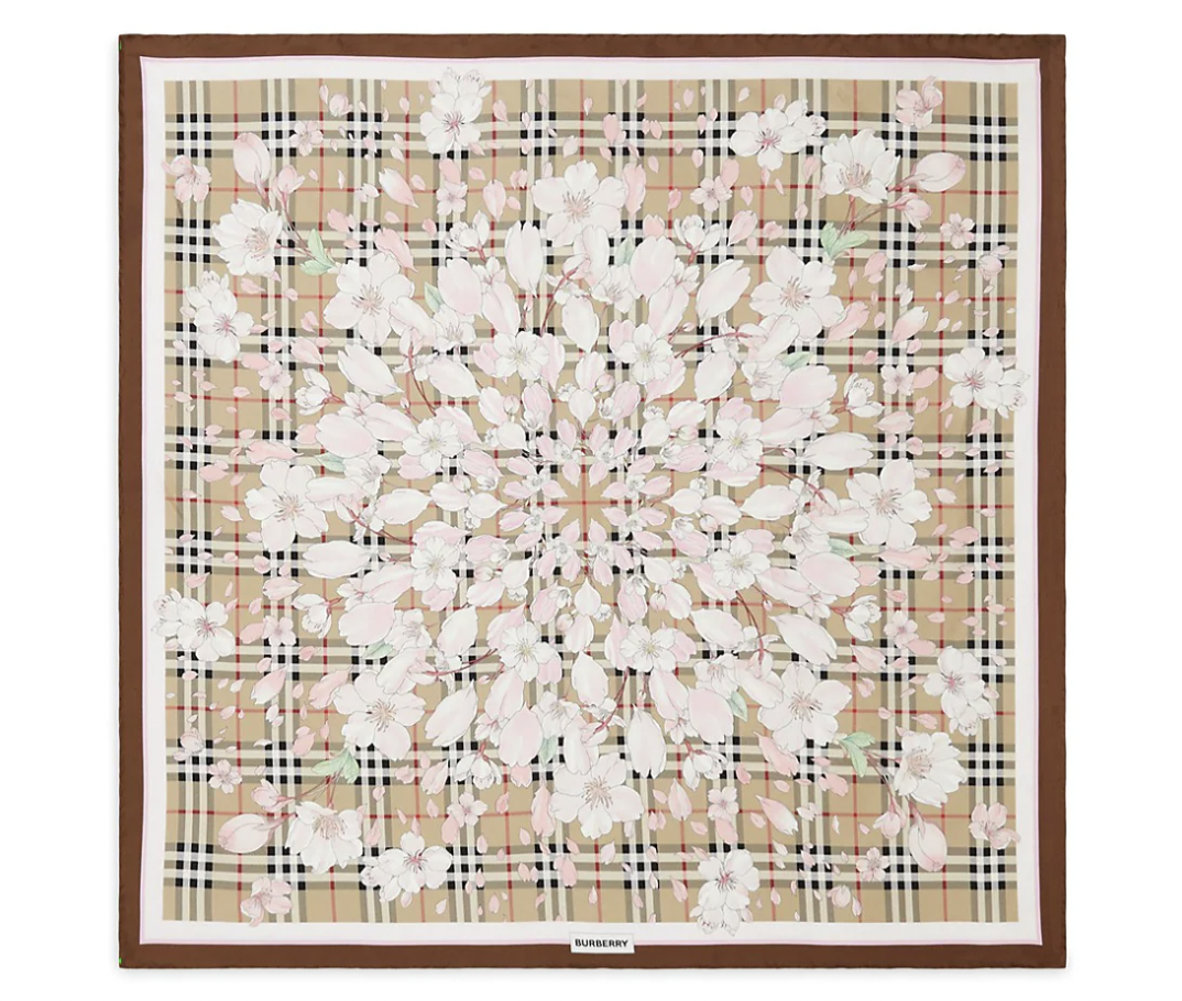 An Italian-woven square scarf in silk twill. The design is screen-printed with Burberry’s Vintage Check overlaid with soft pink cherry blossoms.
