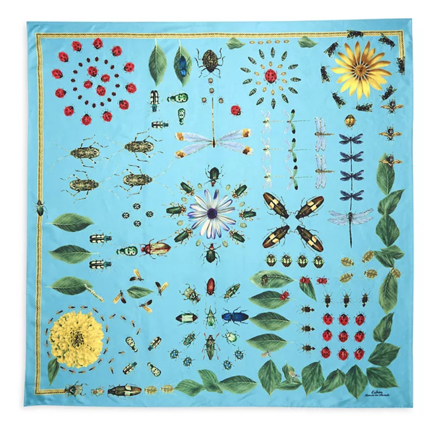 Another lovely silk scarf square from Echo, the Insects on Parade Scarf features leaves and bugs on a lively aqua blue background. This is a scarf you will covet and wear for years to come.