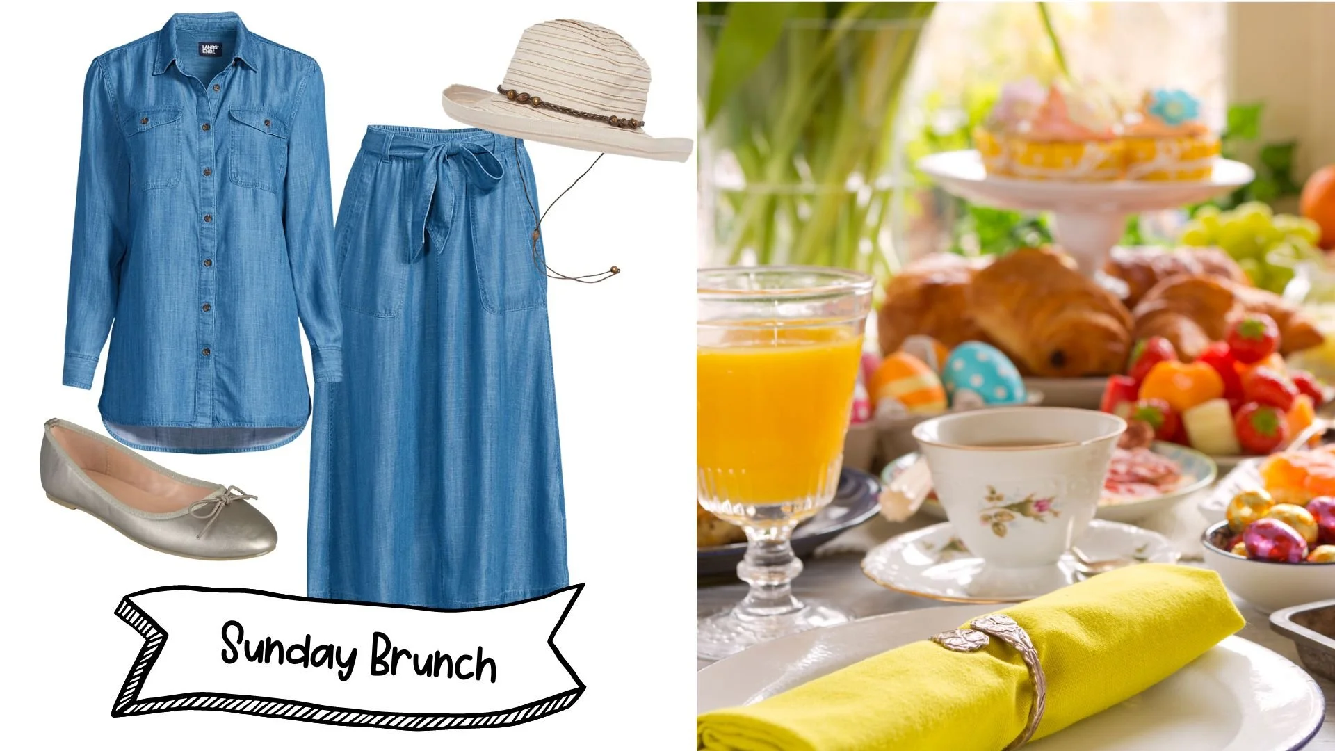 Sunday Brunch: Chambray skirt and top provide the look of a dress. Finish the look with ballet flats and a sun hat.