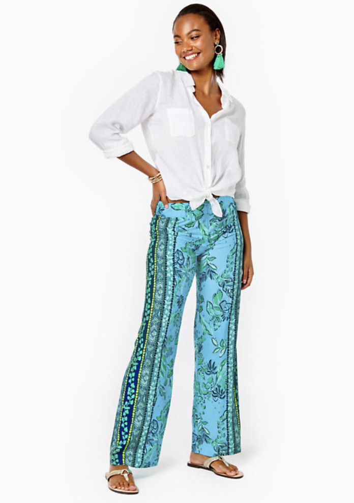 Thanks to its machine washable and wrinkle-resistant fabric, the Bal Harbour engineered print Palazzo Pant offers a dreamily draped silhouette. Pull-on styling and a self-fabric waistband make it a breeze to slip on, too. Pair it with a breezy linen shirt, and gold sandals.